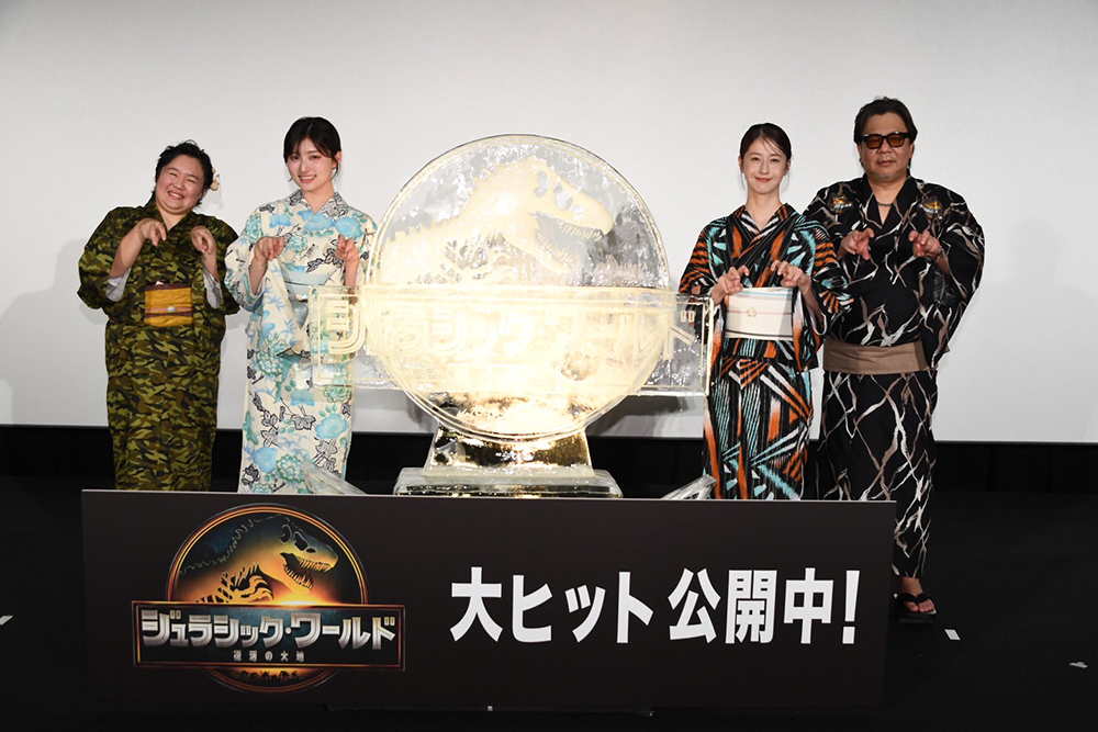 そのような大ヒットを記念して、「新ジュラ夏祭り」と題したスペシャルイベントが開催されました。会場には多くの観客が詰めかけ、日本語吹替版で声優を務めた松本若菜さん(ゾーラ・ベネット役)、吉川愛さん(テレサ・デルガド役)、楠大典さん(ダンカン・キンケイド役)に加え、本作の宣伝隊長で吹替にも挑戦したやす子さんが爽やかな浴衣姿で登場すると、大きな拍手で迎えられました。