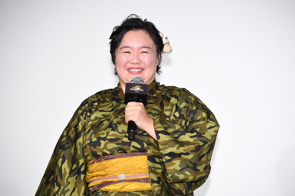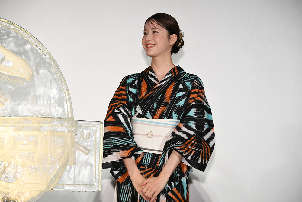 迷彩柄の浴衣に身を包んだやす子さんは「はい~お願いします~!お二人(松本さんと吉川さん)の時よりもシャッター数が少ない気がしますが(笑)、『ジュラシック・ワールド』の世界に入ったらどこにいるのか分からなくなってしまいそうな浴衣ですね~!これから素敵な映画が始まるので、ぜひ楽しみにしていてください」