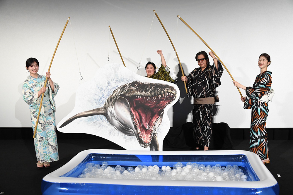 そして、ここからは“新ジュラ夏祭り”にふさわしく、夏祭りの定番ゲーム「金魚すくい」に倣って、「モササウルスすくい」に挑戦しました。モササウルスの入ったボールプールが壇上に登場すると、キャストが覗き込んで「難しそう」という声が上がりました。釣り竿を手に取り、松本さんが「モササウルス、すくうぞ!」と掛け声を上げると「お~!」と全員が団結し、モササウルスすくいがスタートしました。プールに浮かぶモササウルスパネルを懸命に釣り上げる姿に、観客からは笑いと拍手が起こりました。