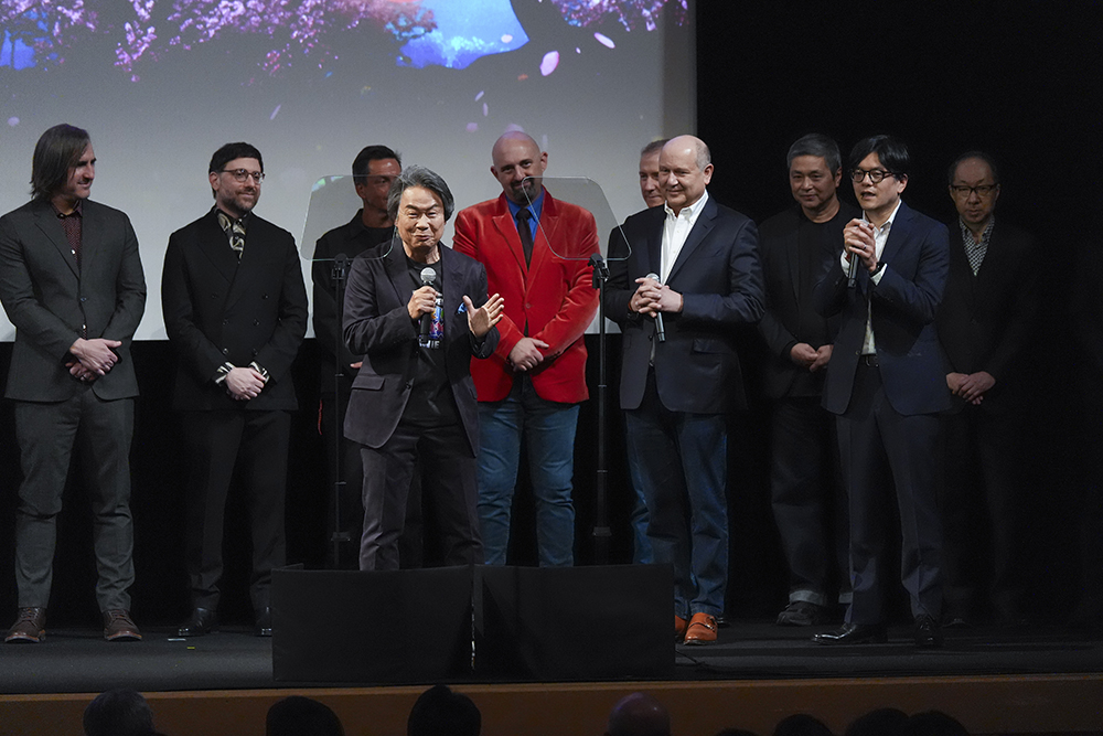 続けて、「これから皆様がご覧になるのは、才能あるクリエイターによる驚くべき共同作業の結晶です。」と力強く締めくくると、本作のスタッフ陣と任天堂のクリエイティブチームを壇上に招き、紹介しました。