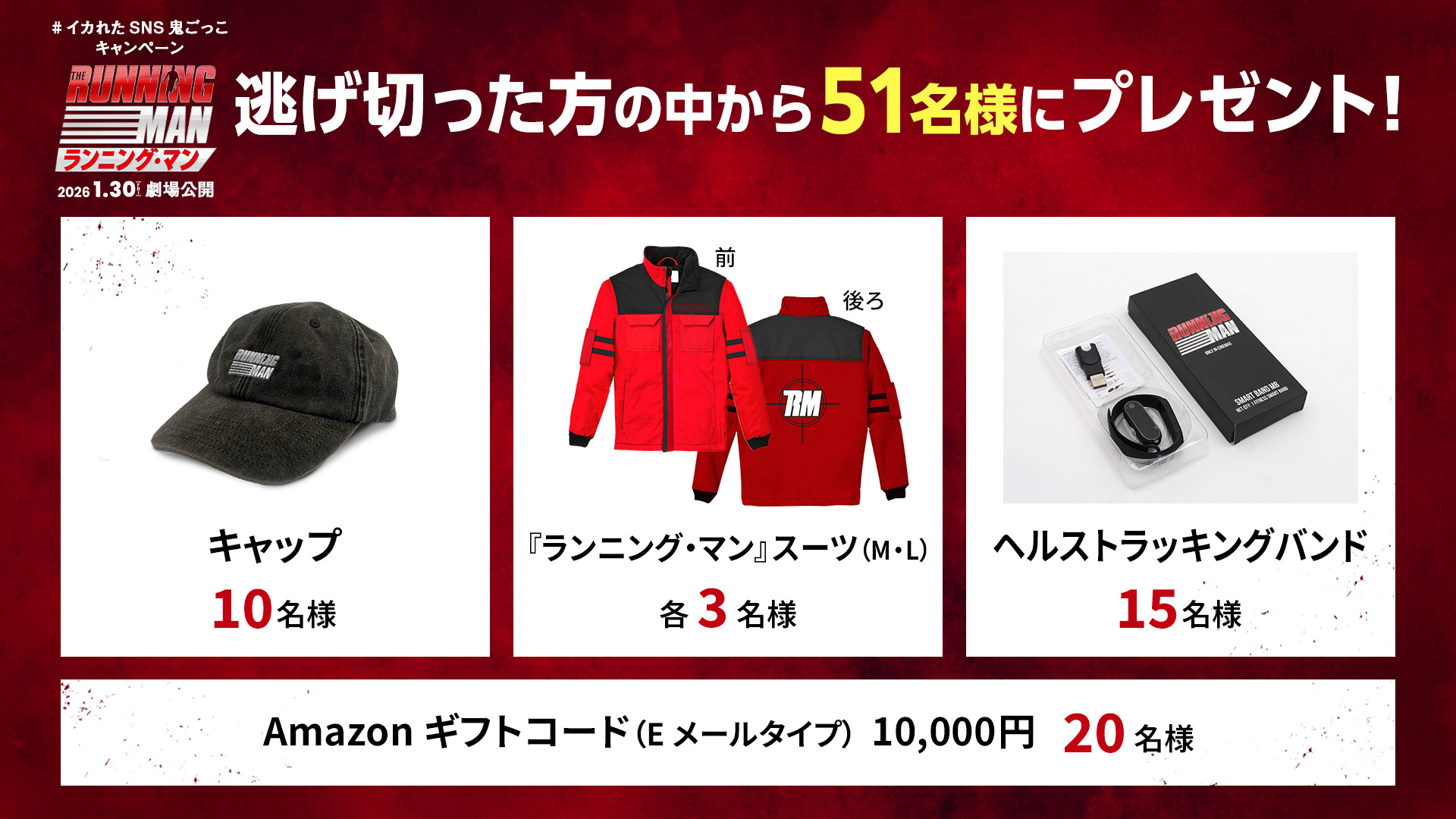 • 応募される際は、映画『ランニング・マン』公式Xアカウントをフォローし、指定ハッシュタグ「#イカれたSNS鬼ごっこキャンペーン」と「@RunningMan_jp」を付けて応募してください。